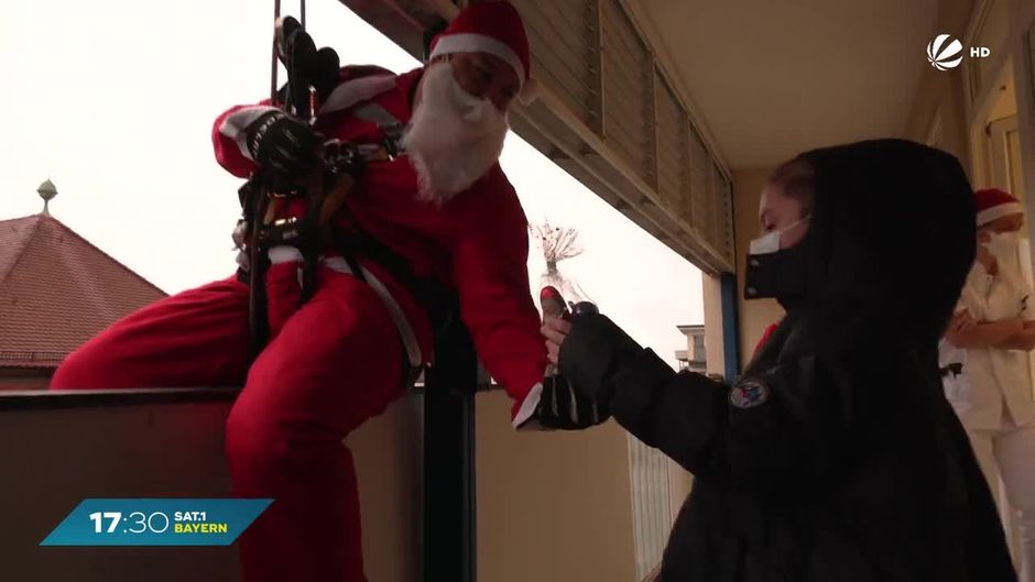Nikoläuse seilen sich an der Fassade ab - zum Nikolaustag gibt es in der Würzburger Kinderklinik eine besondere Überraschung für die kleinen Patientinnen und Patienten.