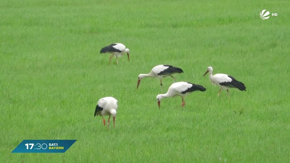 Regenwürmer, Heuschrecken und Co. - wegen des Starkregens gibt es im Rednitztal bei Schwabach eine Menge Köstlichkeiten für Störche.