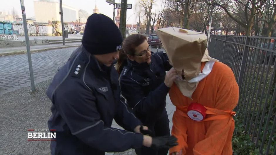 Die Beamten sind gerade in Berlin/Kreuzberg auf Streife unterwegs, als ihnen ein gefesselter Mann auffällt. Er wurde offenbar gefesselt, überfallen und ausgesetzt.