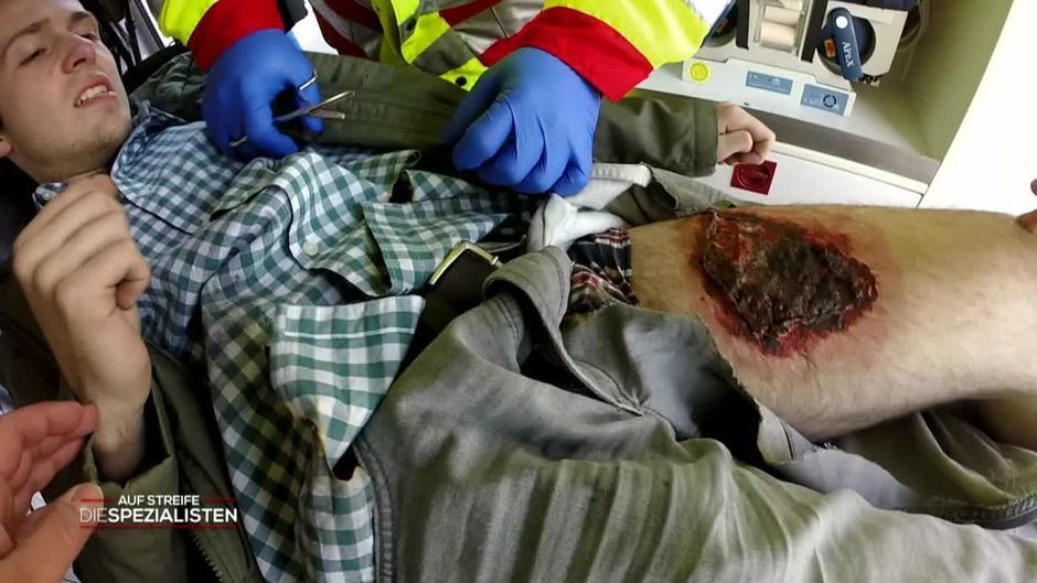 Die Spezialisten entdecken auf der Fahrt ins Krankenhaus ein fahrendes Auto, aus dem Rauch steigt.