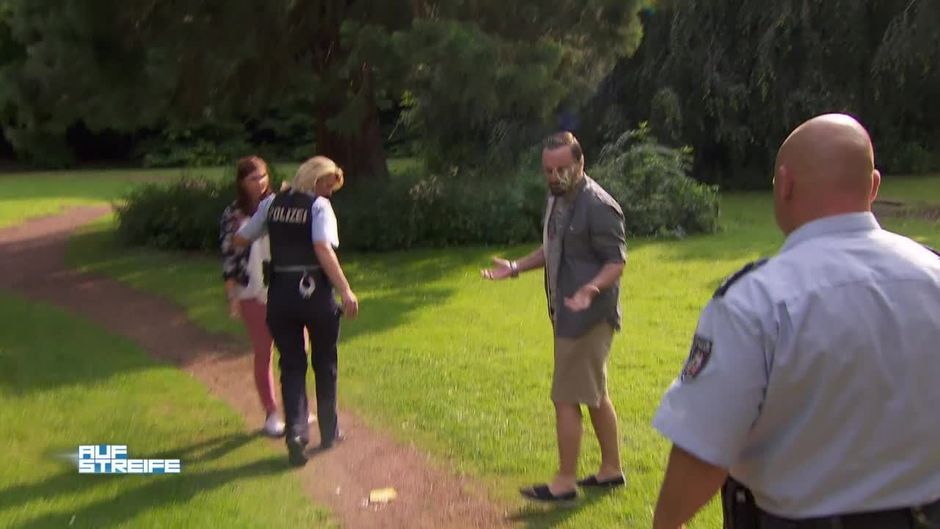 Die Beamten sind in einem Park auf Fußstreife unterwegs. Hier gab es in letzter Zeit häufig Probleme und Beschwerden - und auch jetzt bleibt es nicht lange ruhig.