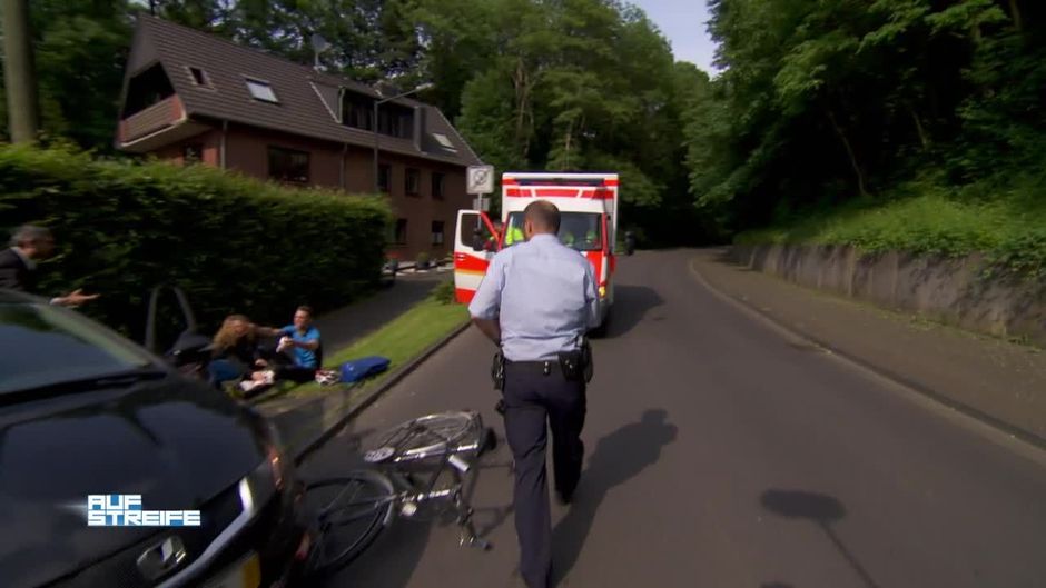Bei einer Einfahrt wird ein Fahradfahrer von einem PKW angefahren. Als die Polizei ankommt, scheint der Streit um die Schuldfrage kurz vor der Eskalation zu sein.