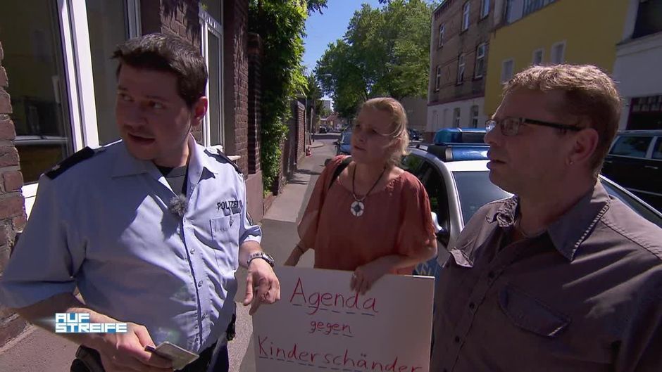 Vor der Wohnung eines Journalisten wüten mehrere Bürger mit Schildern, auf denen er als Kinderschänder beschimpft wird.