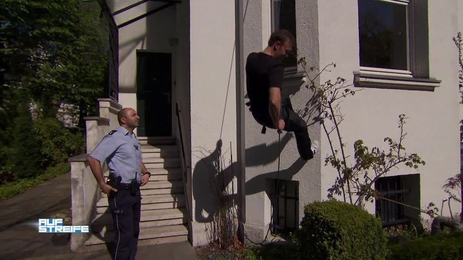 Die Beamten entdecken einen Mann, der mit Klettergeschirr an einer Hauswand hängt. Der Grund ist zunächst unglaubwürdig...