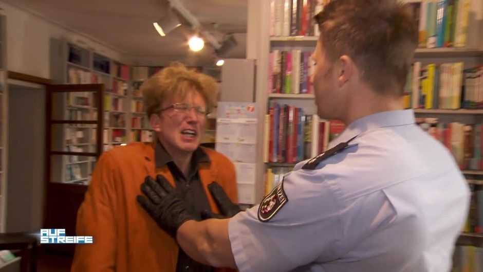 Ein offensichtlich sehr unhöflicher Mann stört die Kunden eines Buchhändlers: Er schmeißt mit unflätigen Begriffen um sich. Können ihn die Beamten stoppen?