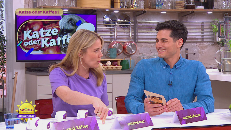 Olcay hat von seiner Bali-Reise einen besonderen Kaffee mitgebracht: Er besteht aus Katzenkot und ist einer der teuersten Kaffeesorten der Welt. Heute lässt Olcay unsere Moderaror:innen Kaffee-Varianten erraten. Schmecken sie den Katzen-Kaffee heraus?