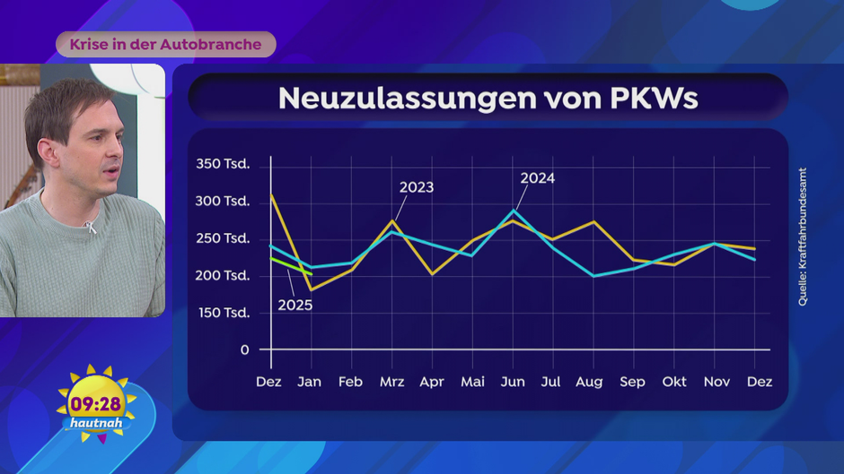 Die deutsche Autoindustrie steckt in der Krise: Sinkende Neuzulassungen, drohende Entlassungen bei Volkswagen bis 2030 und die anhaltende Rezession. Reporter Sebastian Fenske erklärt, was das für die Branche bedeutet und warum E-Autos momentan zulegen.