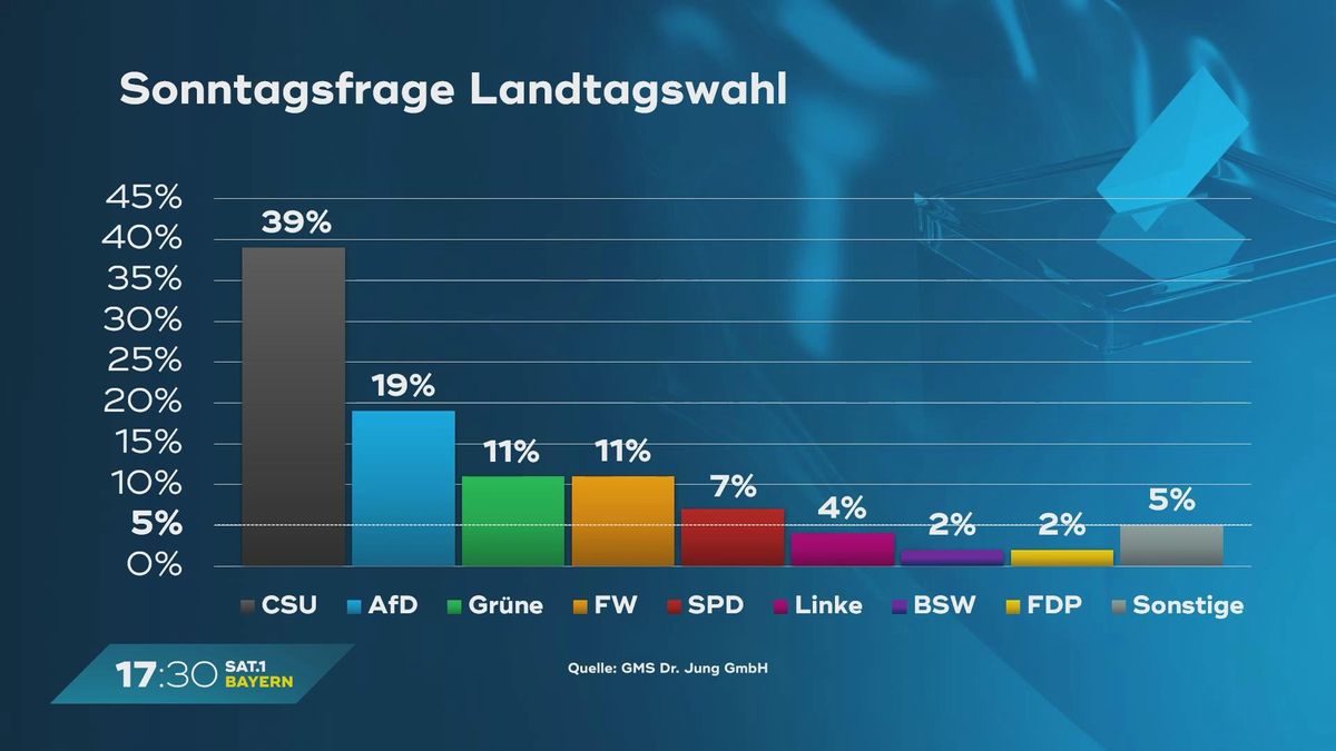 Der 17:30 SAT.1 Bayern Wählercheck mit ANTENNE BAYERN im August 2023 - wie würden die Bayern wählen, wenn am Sonntag Landtagswahl wäre? Wie ist die Meinung zu den Spitzenkandidaten vor der Landtagswahl im Herbst? Die aktuelle Wahlumfrage für Bayern.
